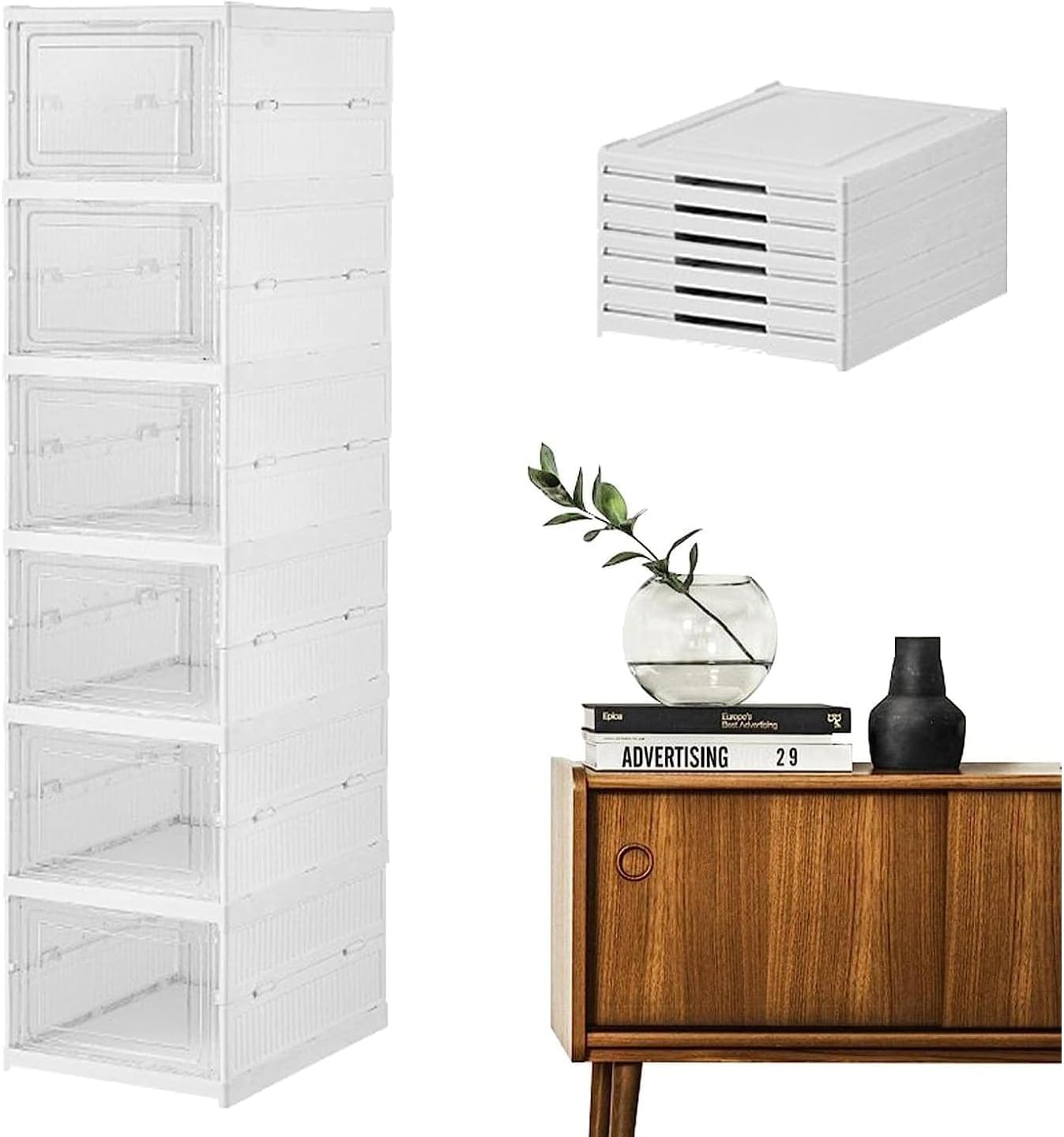 Este estante de zapatos está hecho de plástico ABS y pp claro y robusto para garantizar que sus zapatos estén protegidos del polvo y la suciedad. la Caja de zapatos plegable está libre de montaje, extraerla del embalaje y desplegar todos los paneles y puertas. su caja de zapatos de 6 capas estará lista en 1 minuto. ¡ adiós a la Caja de zapatos ensamblada con complejidad! Es adecuado para almacenar todo tipo de zapatos, incluidos tacones altos, zapatillas deportivas y botas.
